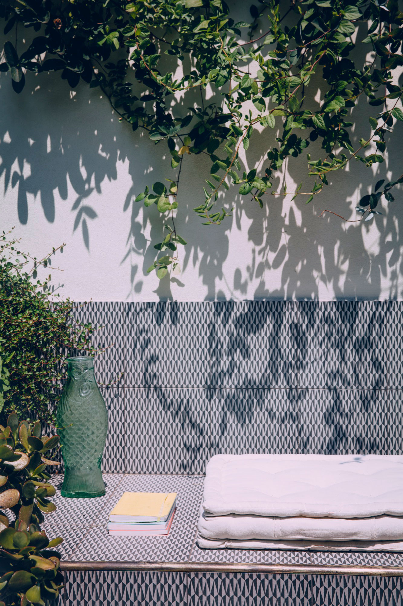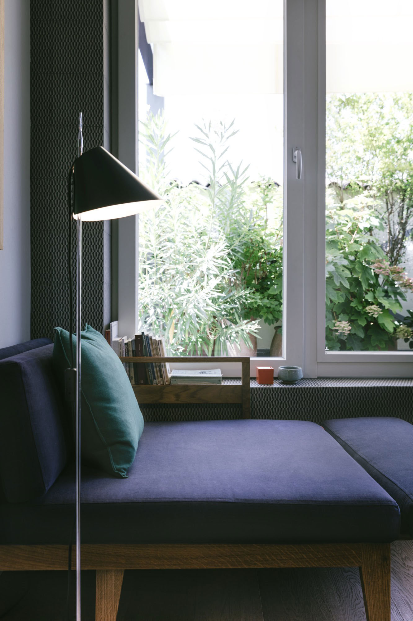 Interno ed esterno dialogano attraverso la comunanza dei materiali e delle superfici di rivestimento, che ritornano a decorare la grande parete vetrata e i dettagli dell’arredo fisso all’esterno.