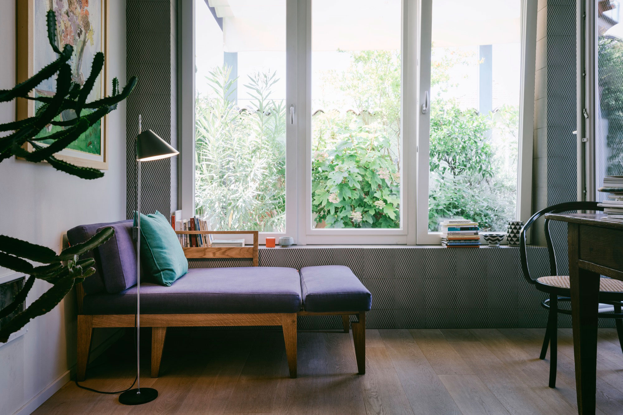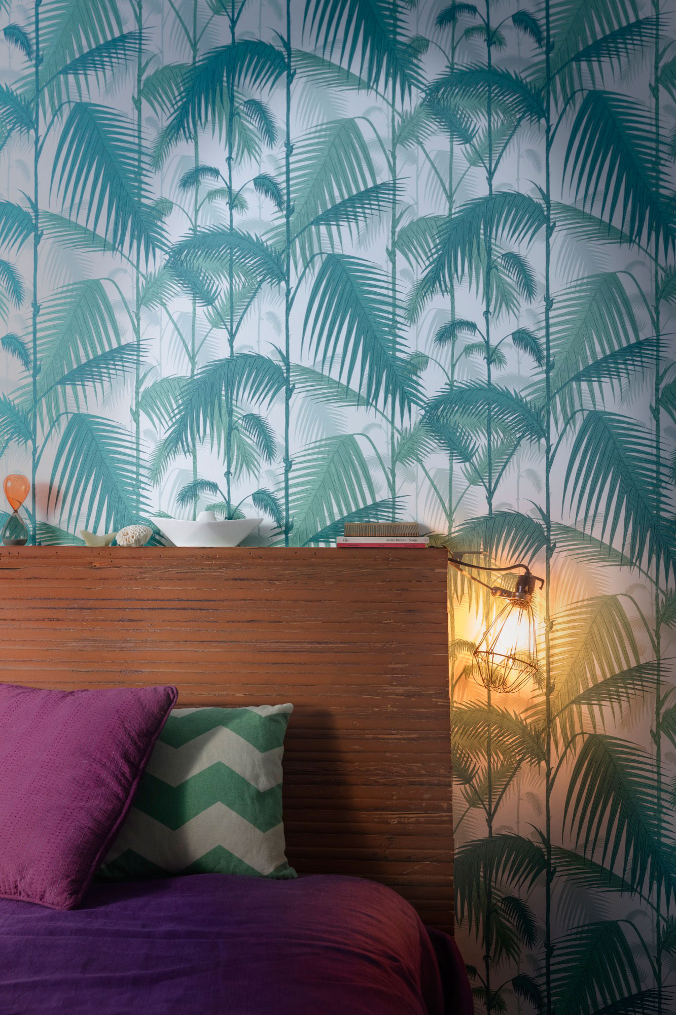 Accenti giocosi di dialogo fra interno ed esterno tornano nella stanza, in cui l’alcova è rivestita con una tappezzeria-giungla e la testiera del letto diventa lo schienale di una panchina.
