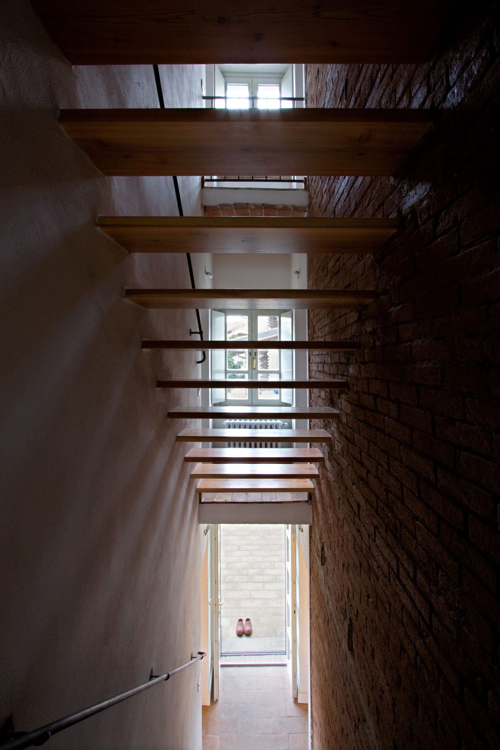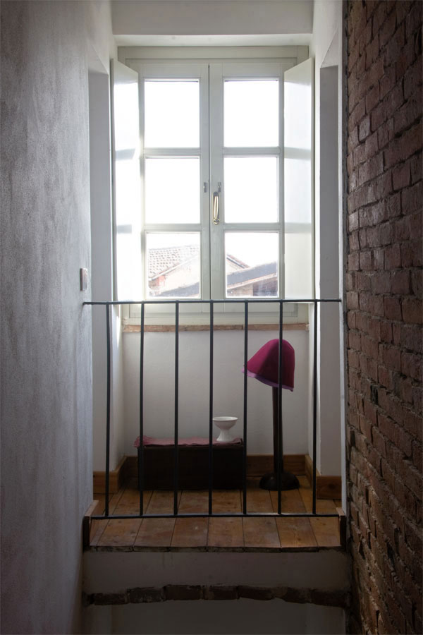 La scala centrale viene svuotata e resa aerea e luminosa per portare luce su tutta l’altezza, nella parete portante viene lasciata la superficie in mattoni faccia a vista, e il pianerottolo si affaccia sul vuoto come un piccolo balcone interno, creando un collegamento visivo fra i vari piani.