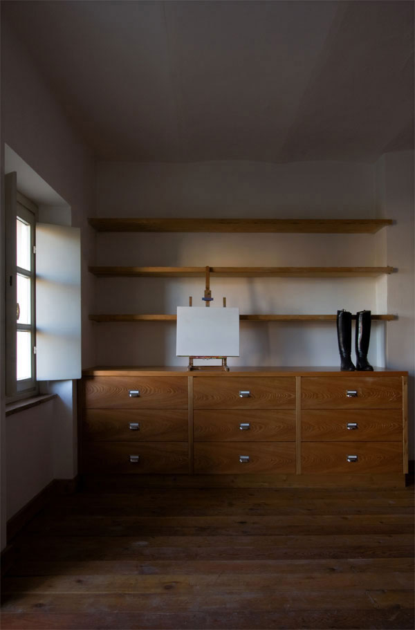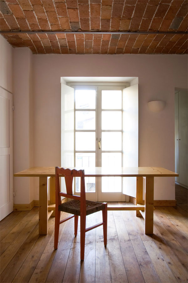 Per i pavimenti si è optato per la conservazione del cotto naturale già presente, disposto in continuità sia al piano terra che nella corte esterna, per creare un suolo unico che fluisce fra interno ed esterno, mentre ai piani superiori sono stati posti semplici assi di abete fissate a magatelli a pavimento, come “all’antica”.
