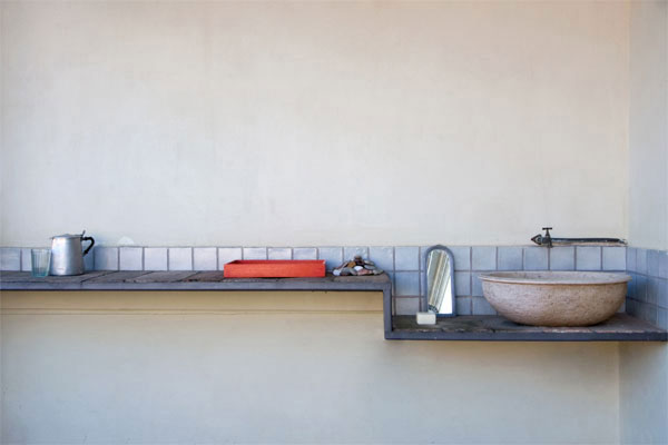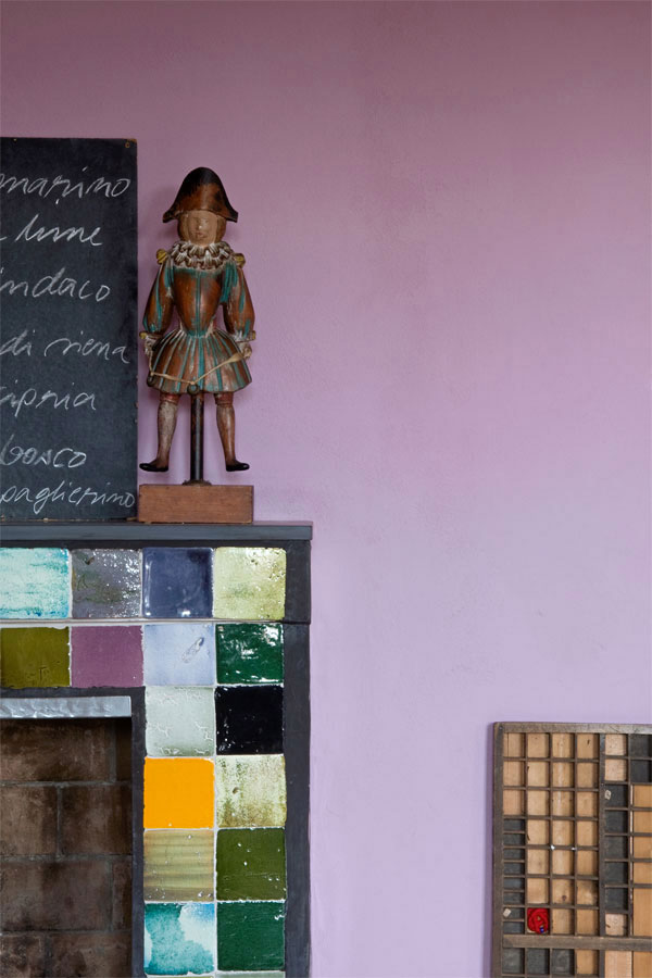 L’intonaco e le pitture sono a calce naturale, i rivestimenti scelti in piastrelle fatte a mano in ceramica smaltata, alternate a pietra di luserna.