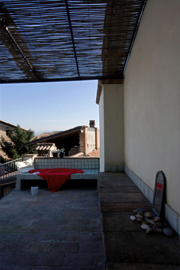 La vista sulle colline si apre dal terrazzo dell’ultimo piano, corredato da un’ampia panca rivestita su cui sostare e abbracciare il panorama.